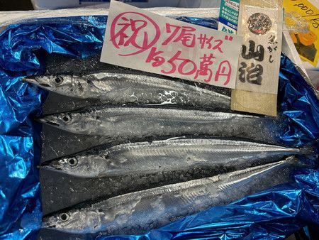 由於到貨量大,整體批發價較去年大幅下降,但一隻140克的大型秋刀魚每條售價超過7萬日圓。購買該產品的中間批發商「山治」社長山崎康弘表示:「除了鼓勵經濟,也代表我們向漁民表示感謝之意」,該批魚預計在美國的壽司店使用。