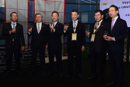 宮城縣知事村井嘉浩(中右)與全國知事會等人在日本食品宣傳活動上舉杯=21日、法國・巴黎郊區