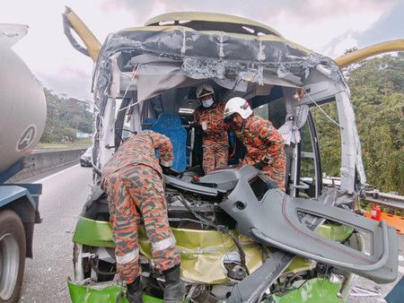 馬來西亞西部霹靂州24日發生事故,旅遊巴士嚴重受損=取自當地消防救援當局的Facebook網頁