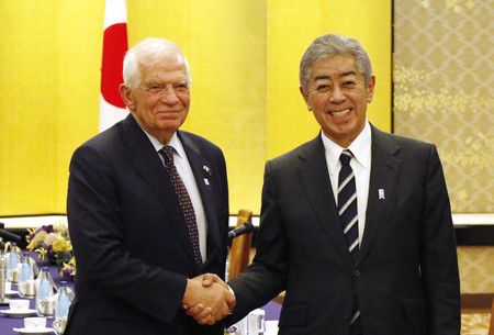 岩屋毅外相(右)與歐盟外交安全高級代表博雷爾會面=1日下午、東京都港區