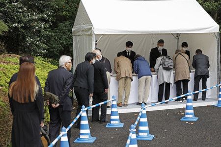 前來哀弔並在三笠宮百合子妃的弔唁簿上簽字的人們=16日上午、東京都港區赤坂御用地(代表攝影)