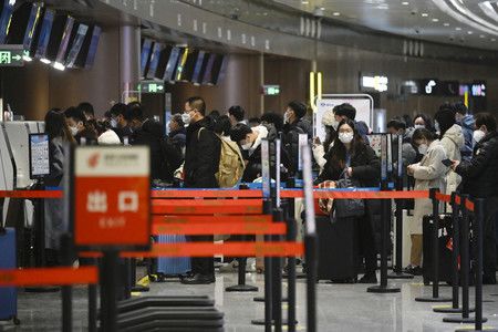 北京大興國際機場,旅客排隊辦理登機手續=2023年1月19日、中國・北京(AFP時事)