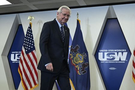 美國鋼鐵工人聯合會 (USW))主席麥考爾=2024年4月17日、賓州匹茲堡(AFP時事)
