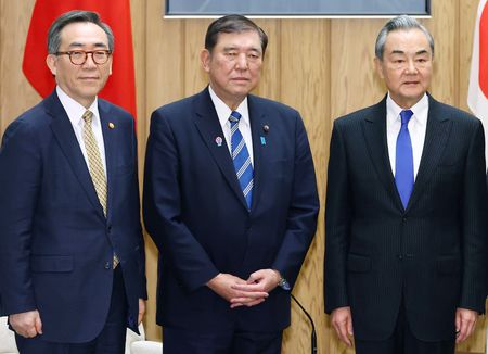 石破茂首相接見中國政治局委員兼外交部長王毅(右)和韓國外交部長趙兌烈(左)=21日、首相官邸