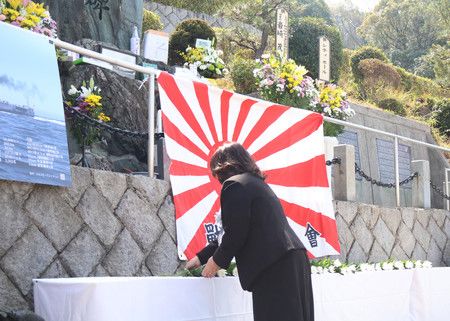 大和號沉沒滿80週年,緬懷戰爭死難者=家屬在廣島吳市獻花