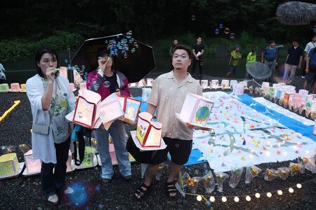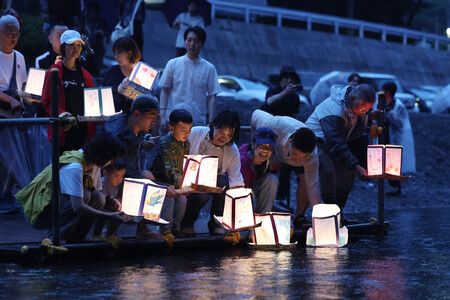 約200盞寫著給罹難者留言的手工河燈被點亮。所有參與者默哀後,將河燈放入川中。