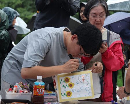 日航客機墜機事故將屆40週年,罹難者家屬河口亞慧(近景)正在寫下訊息=11日下午、群馬縣上野村