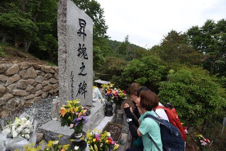 人們結束蠟燭供養後,凝視著刻有犧牲者姓名的石碑=12日下午、群馬縣上野村