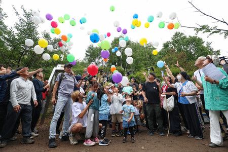在日航客機墜機事故現場的「昇魂之碑」前,人們放飛氣球悼念犧牲者=12日上午、群馬縣上野村