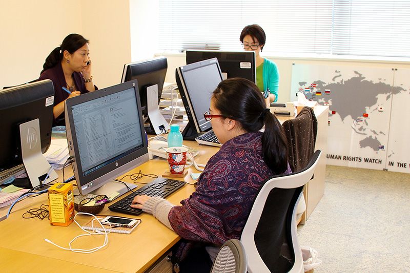 HRW東京辦事處有6名專職員工,加上志工和實習生共10人左右。員工分屬HRW各部門,土井女士解釋說,就是那種上司在國外的情形。