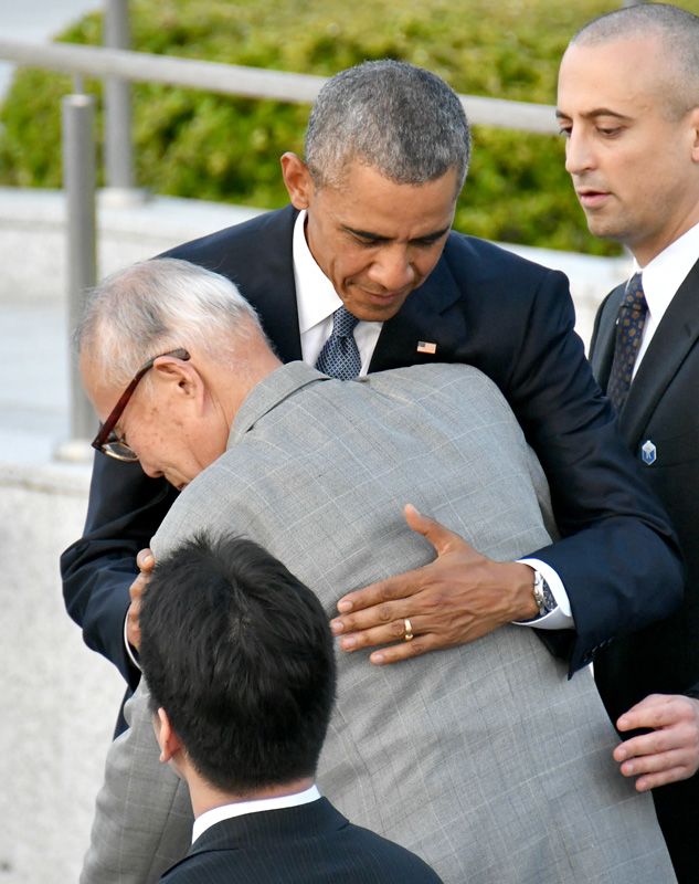 2016年5月27日,歐巴馬總統站在距離廣島和平紀念公園的中心「永久之燈」僅數公尺的地方,他的手輕輕地放在一位原爆倖存者的肩上。接下來的瞬間,發生了令人意想不到的事情。歐巴馬總統將79歲的森重昭老先生輕輕擁在自己胸前。