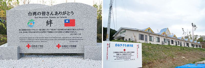 左圖為宮城縣南三陸町南三陸醫院的紀念碑/右圖為岩手縣山田町的日臺「絆」(日語發音為kizuna,深厚情誼之意――譯註)幼兒園(攝影:nippon.com 編輯部 高橋郁文)