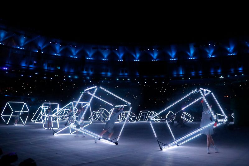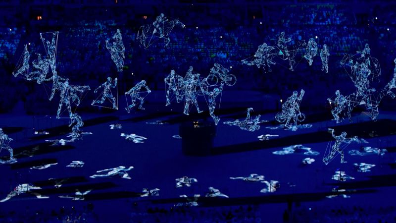 里約奧運閉幕儀式上運用AR(擴增實境)做展演的樣貌。奧運會場上的實際演出及用CG所描製而成的33項競技的影像在同一時間融合呈現(提供:Rhizomatiks research)
