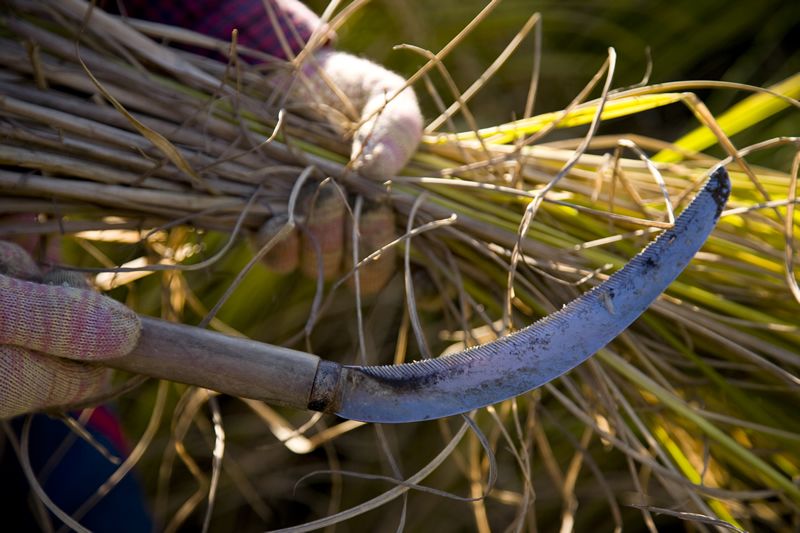 「雖然梯田也可以用聯合收割機收割,但在田埂邊彎曲大的地方,就還只能用鐮刀。鐮刀帶有鋒刃利齒,無需費力,收割作業簡單輕鬆。」