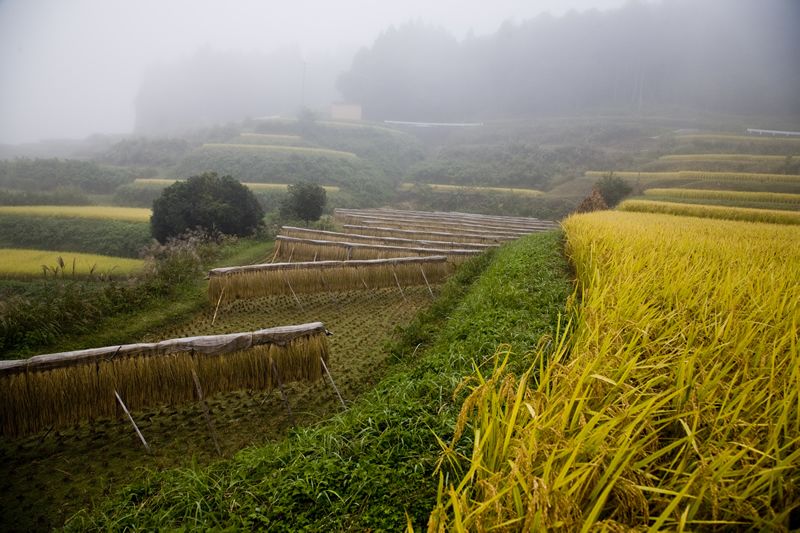 晨霧籠罩的梯田。由於上午霧濃,稻穗上掛著露珠,所以主要是在濃霧散去後的下午收割。