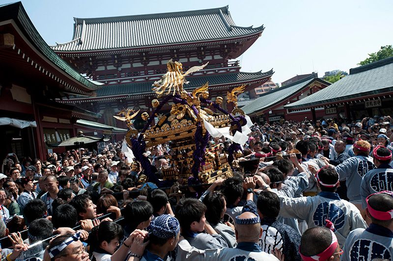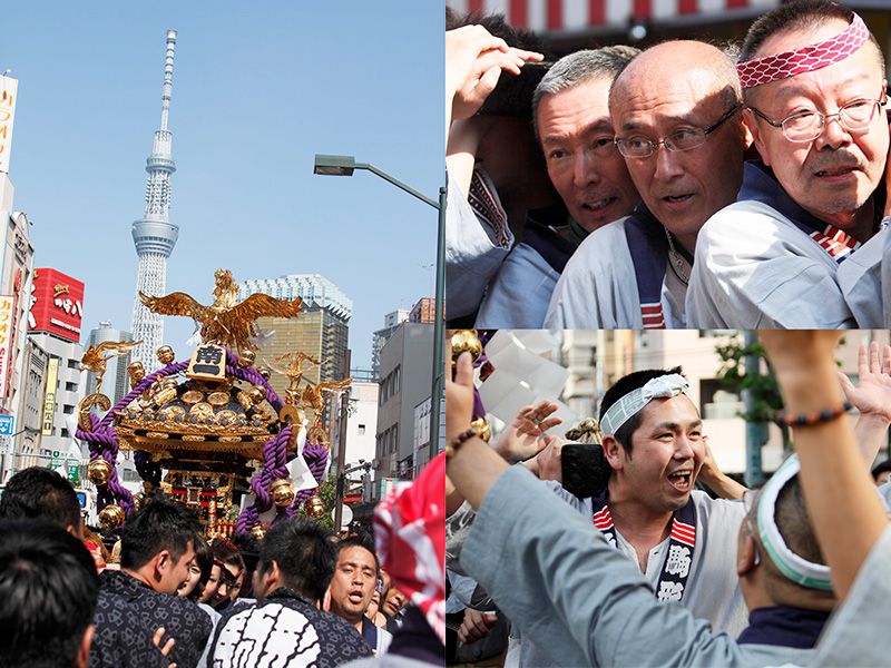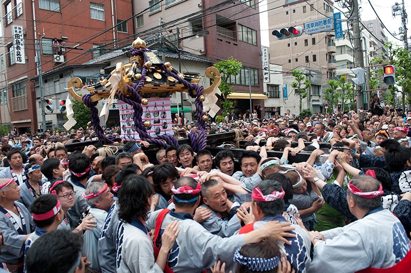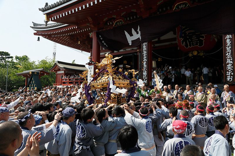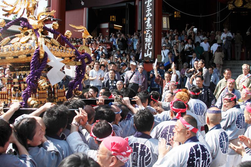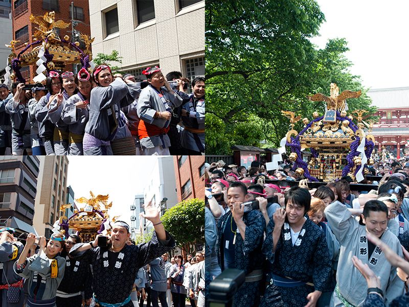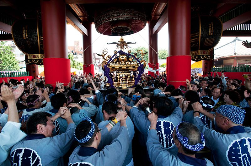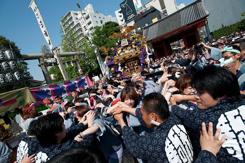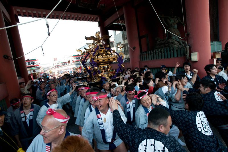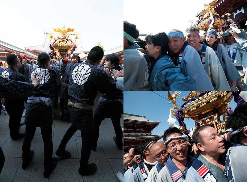 2012年5月19日下午兩點。祓除儀式之後,駒形街道社區管委會的神轎從淺草神社出發了。在淺草寺的正殿前,街道神轎被高高抬起。這是向觀世音菩薩致敬的瞬間。觀眾的歡呼聲響徹雲霄。隨後,神轎被劇烈地搖晃起來,依次穿過擁擠的商店街大道和雷門;走上寬闊的大街後,人們更加劇烈地搖晃著神轎。遠處的東京晴空塔似乎也在靜靜地守望。