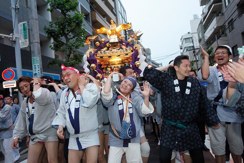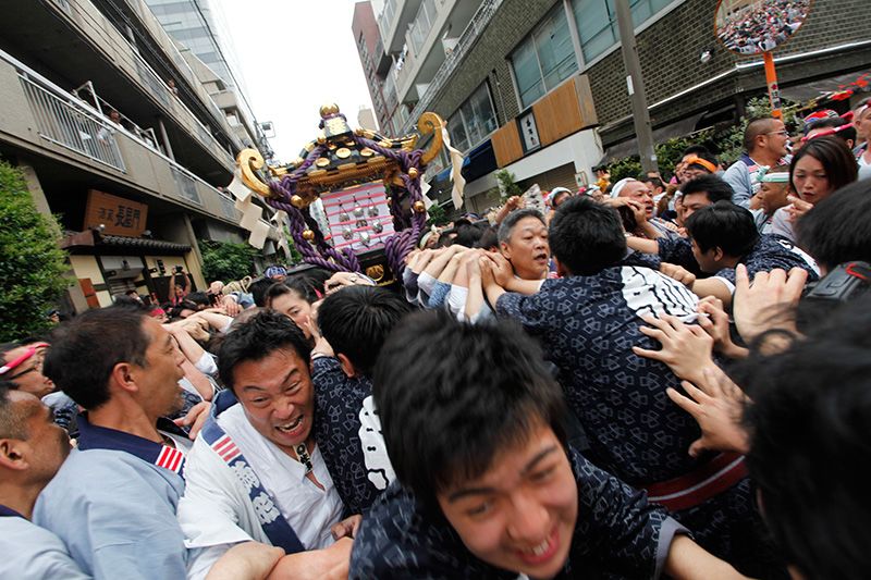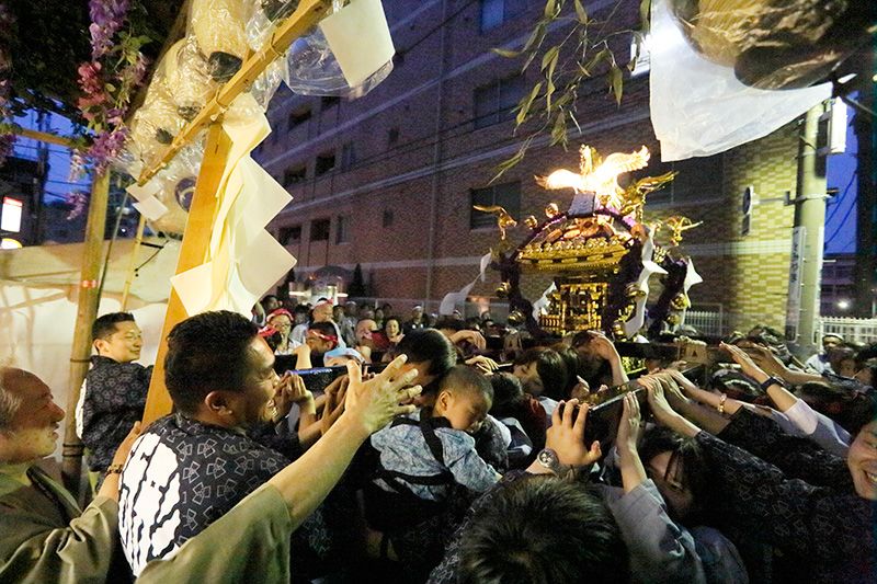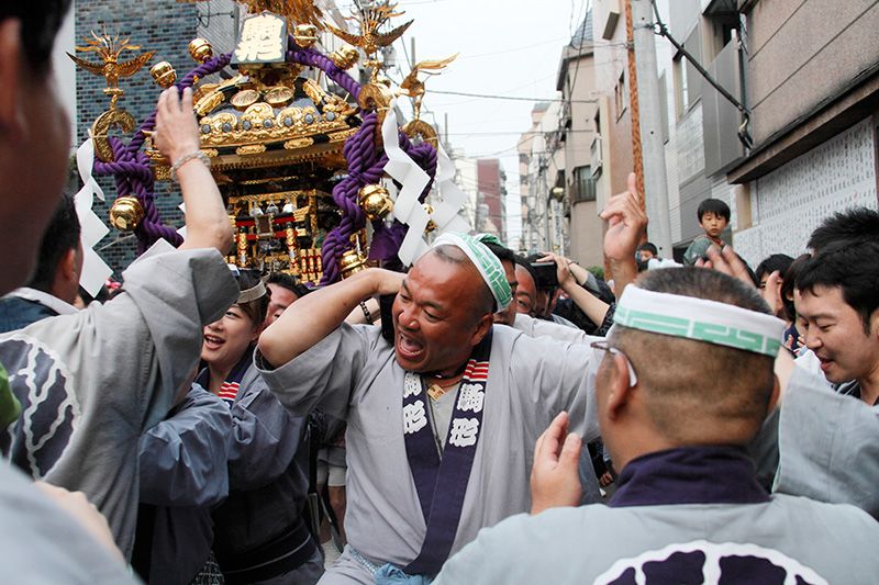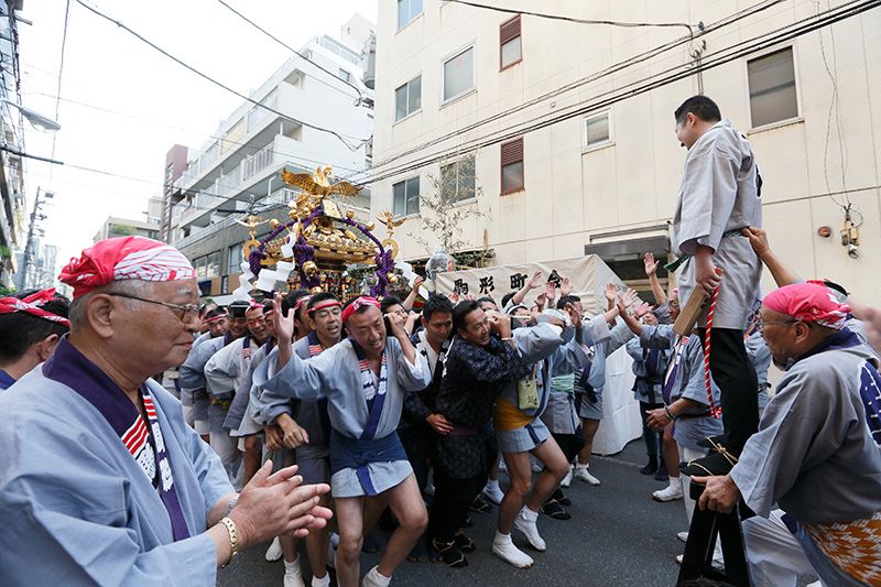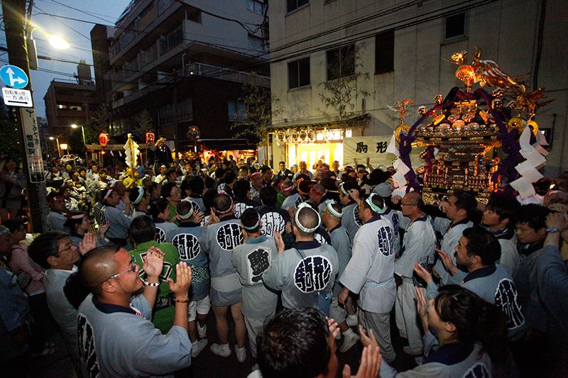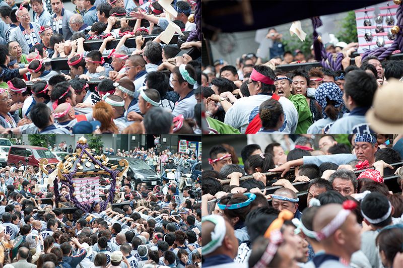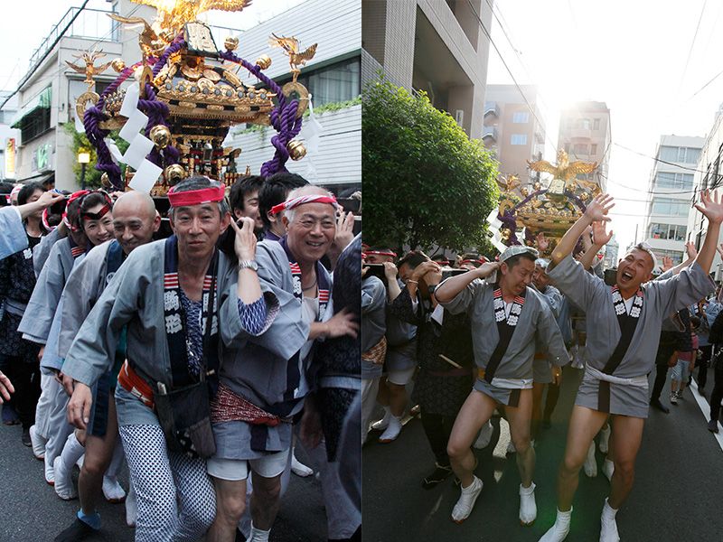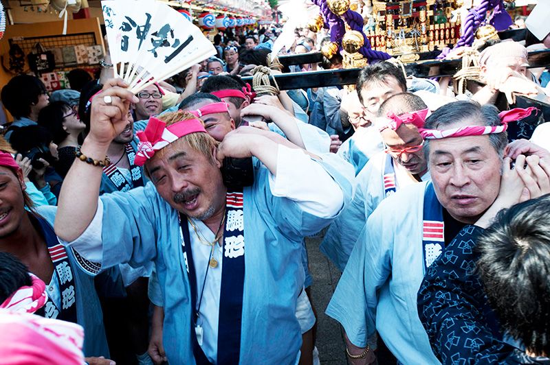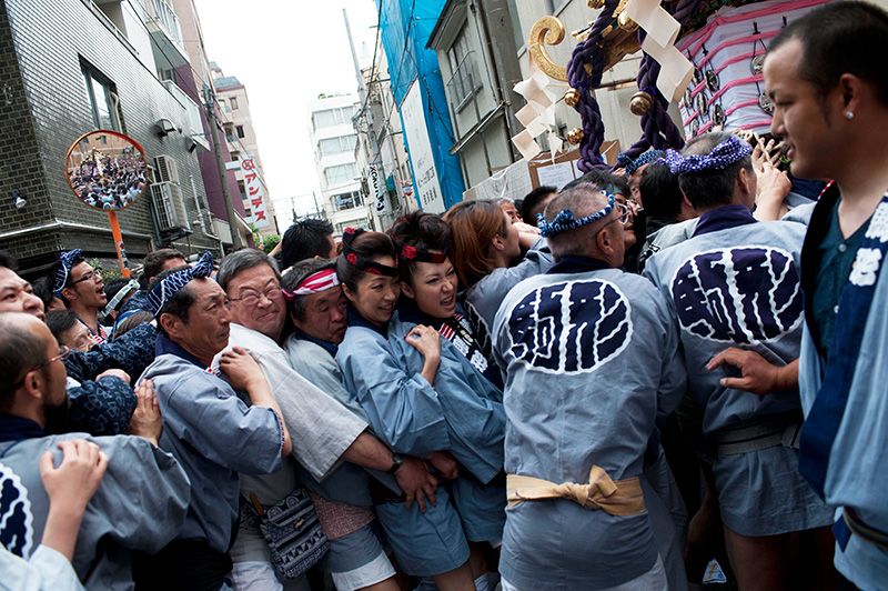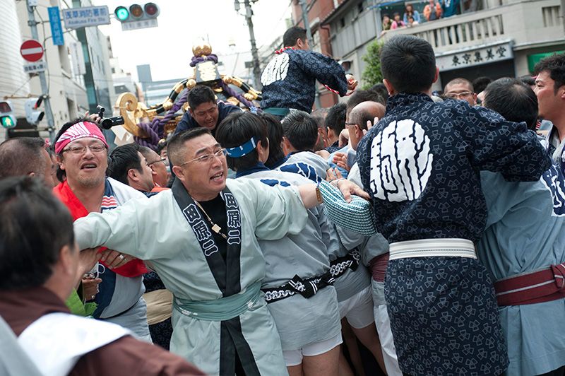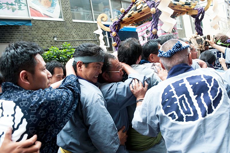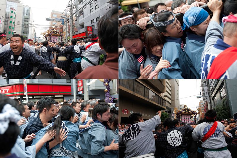 三頂神轎被人潮擠得搖搖晃晃,艱難行進在駒形街道上。亢奮的人們爭著抬轎,使得神轎有時只能蜿蜒蛇行,有時甚至倒退。狹窄的小巷裏,青年會的成員們奮力撥開擁擠不堪的轎夫人群,為神轎引路。即使有些不愉快的事情發生,也都在預料之中,他們會冷靜對應。