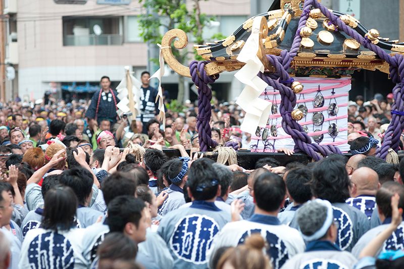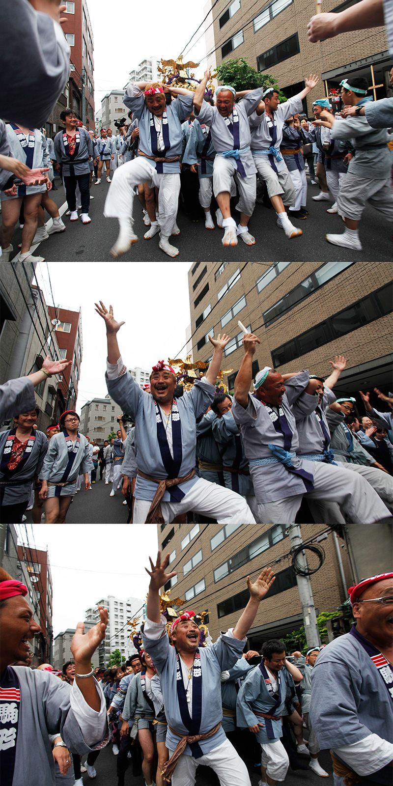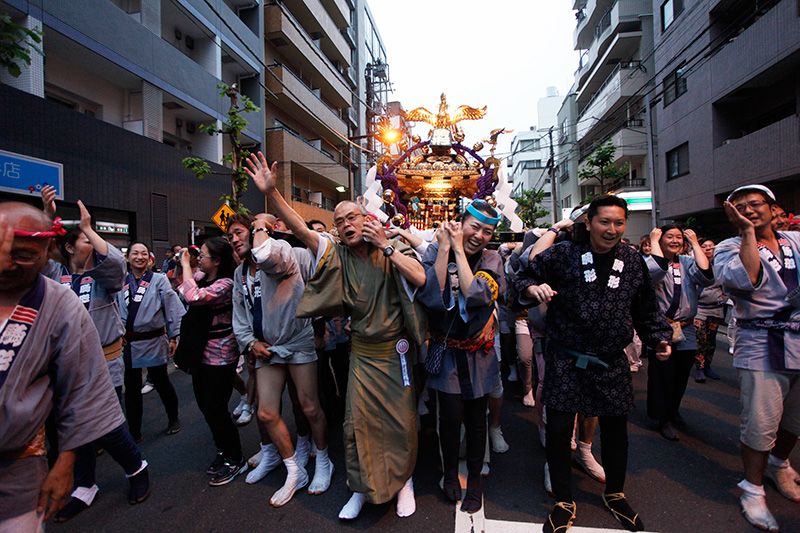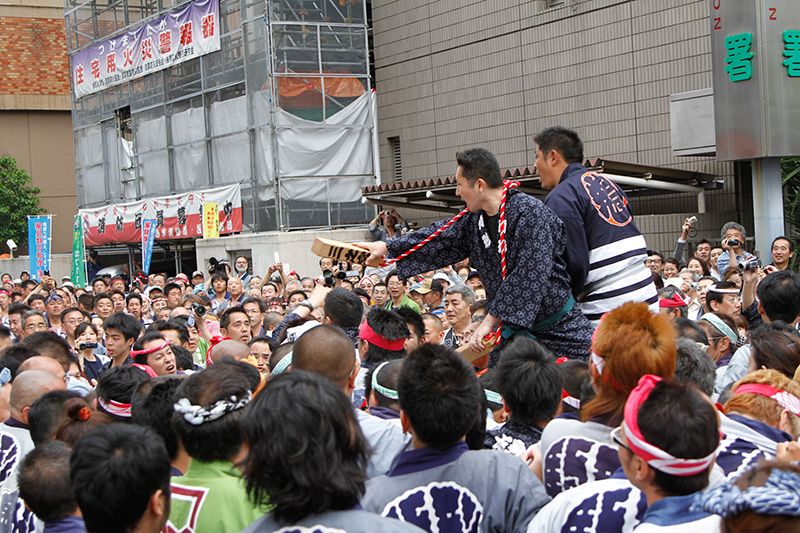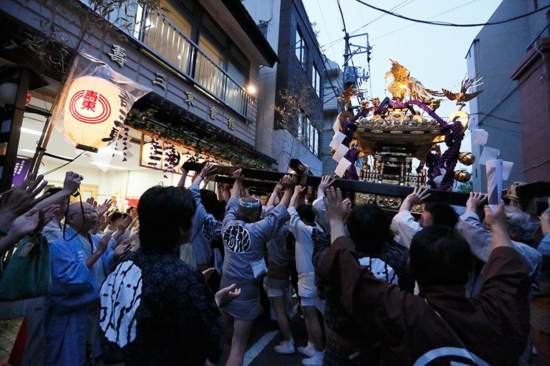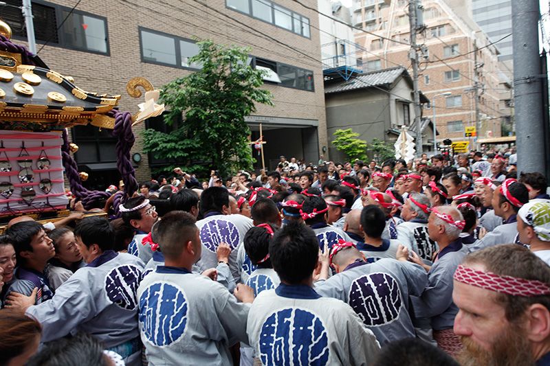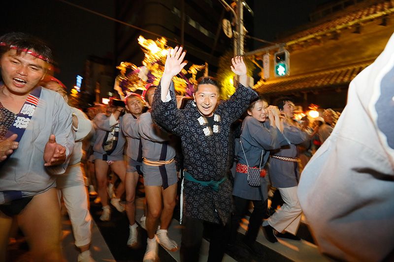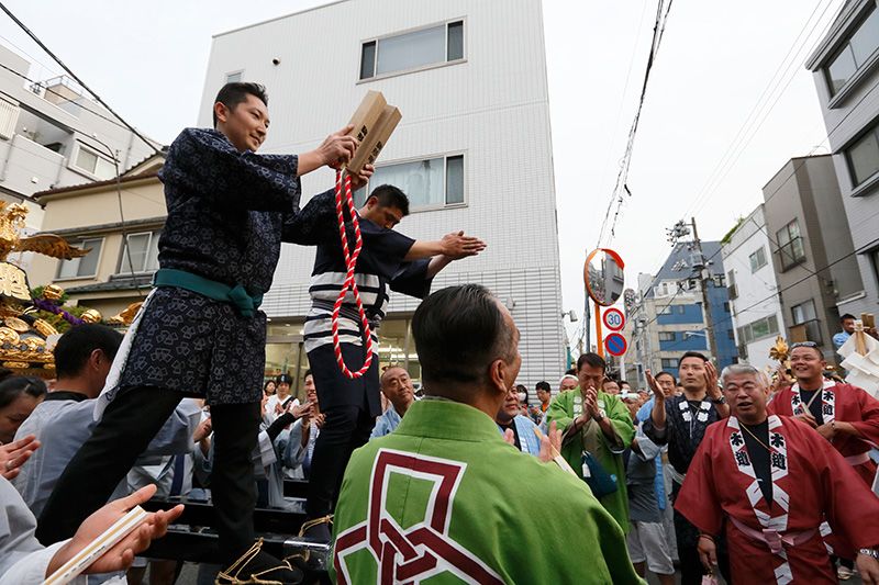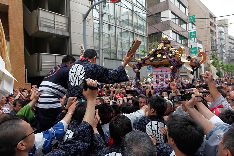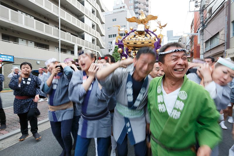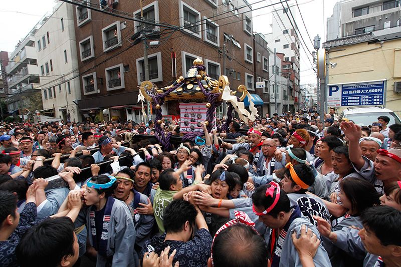 三頂神轎被人潮擠得搖搖晃晃,艱難行進在駒形街道上。亢奮的人們爭著抬轎,使得神轎有時只能蜿蜒蛇行,有時甚至倒退。狹窄的小巷裏,青年會的成員們奮力撥開擁擠不堪的轎夫人群,為神轎引路。即使有些不愉快的事情發生,也都在預料之中,他們會冷靜對應。