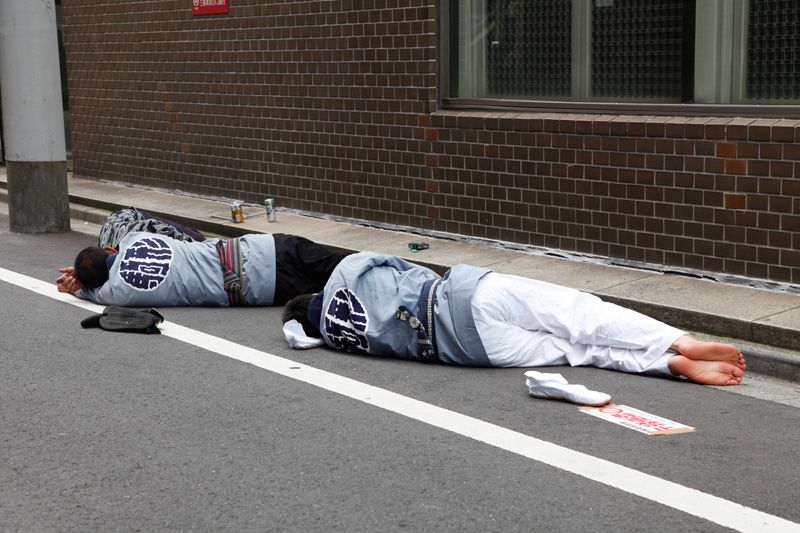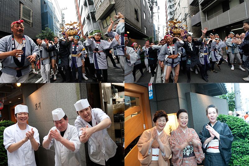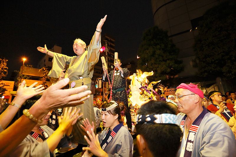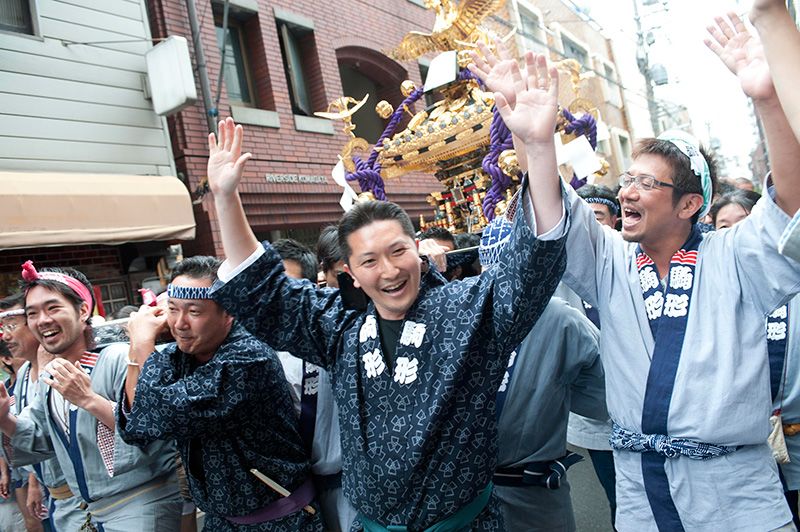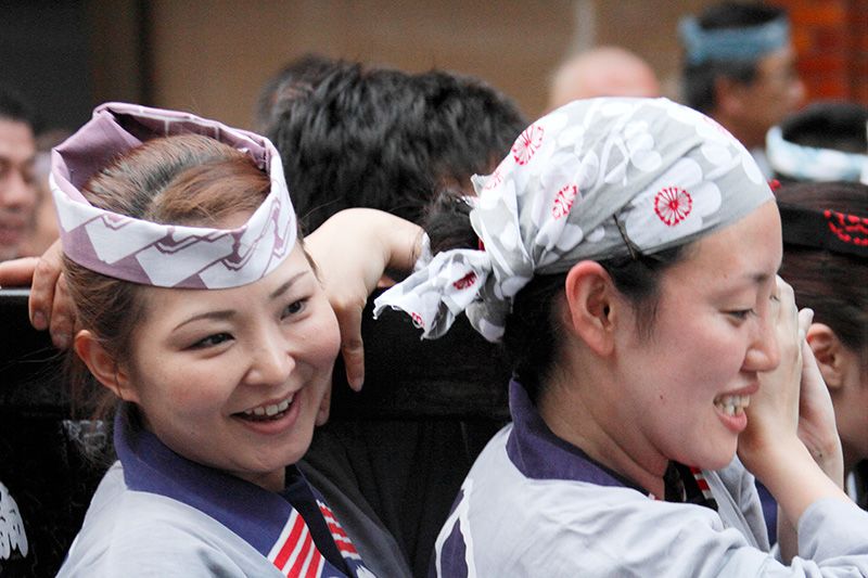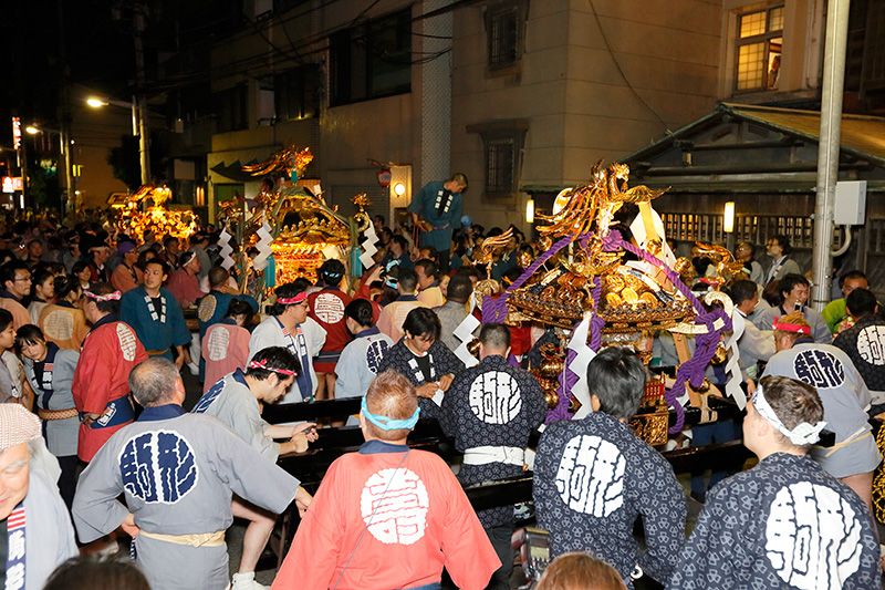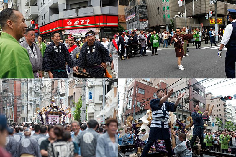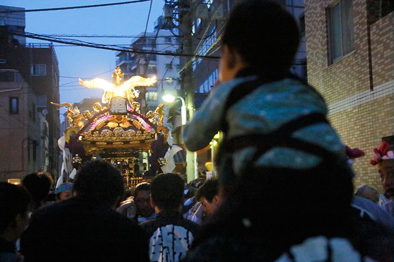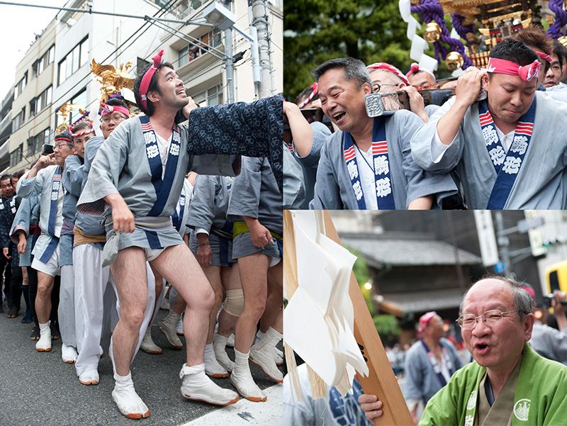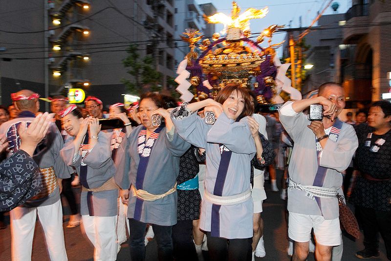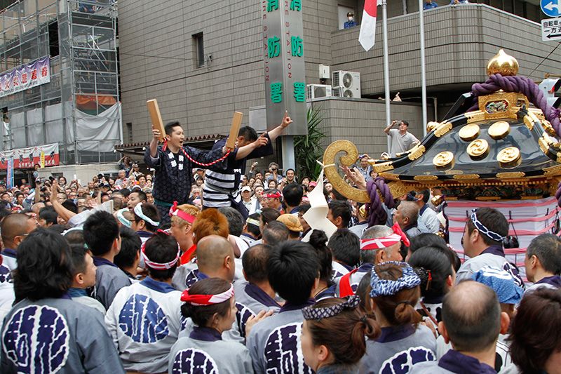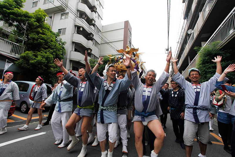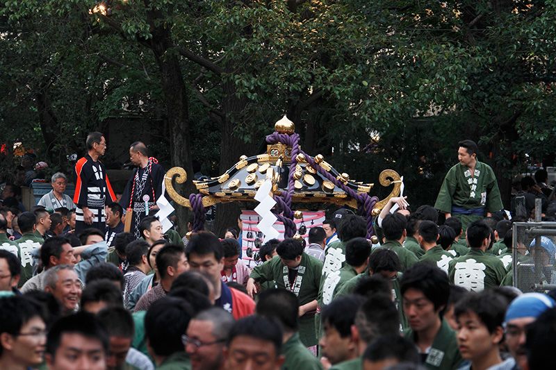 三頂神轎被人潮擠得搖搖晃晃,艱難行進在駒形街道上。亢奮的人們爭著抬轎,使得神轎有時只能蜿蜒蛇行,有時甚至倒退。狹窄的小巷裏,青年會的成員們奮力撥開擁擠不堪的轎夫人群,為神轎引路。即使有些不愉快的事情發生,也都在預料之中,他們會冷靜對應。