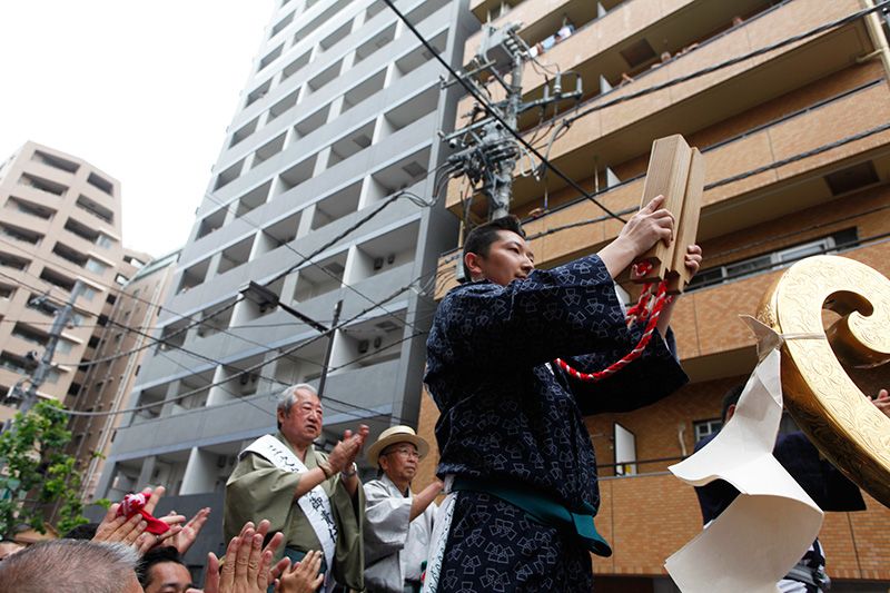 青年會長恩田帶頭擊掌鼓勁。淺草神社的祓除儀式之後,終於出發了