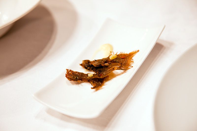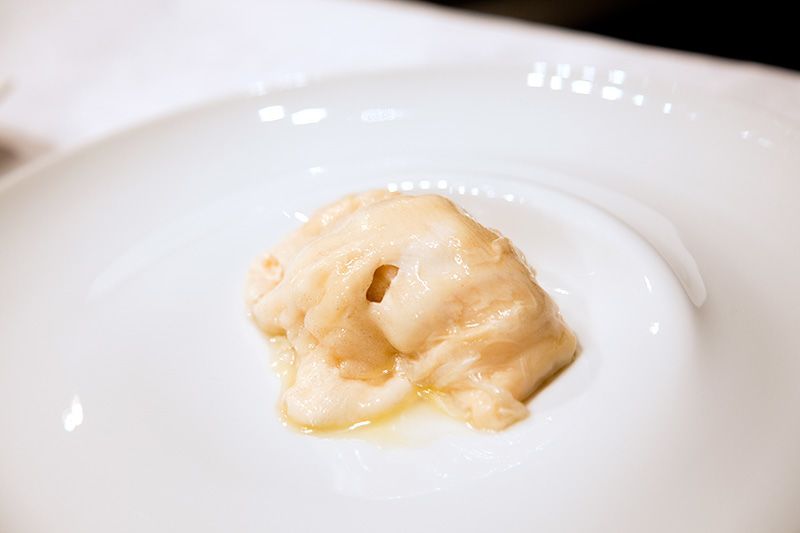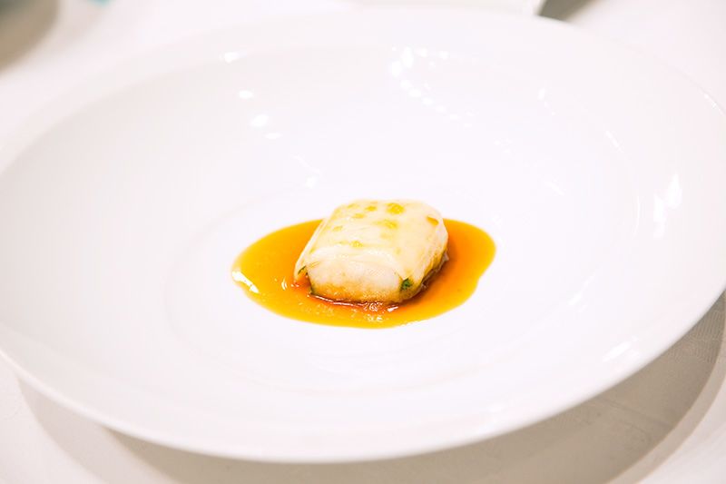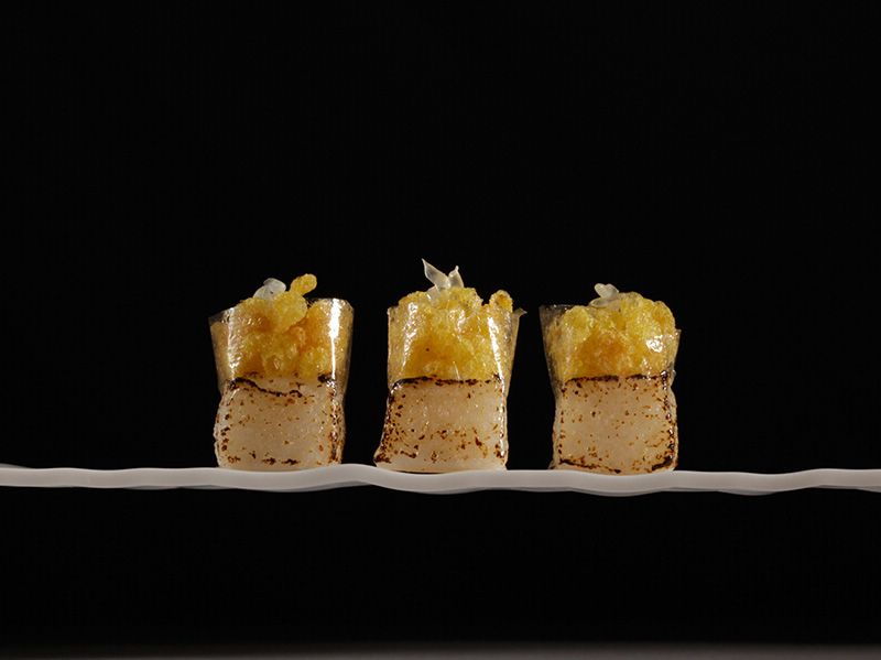 羅馬風味烏賊。用糯米紙包裹,營造出天婦羅外皮的感覺,中間用柚子提味