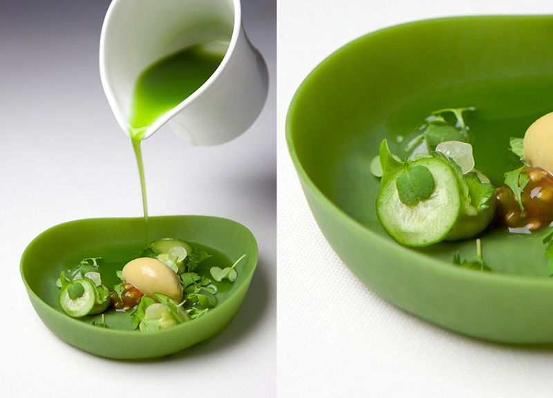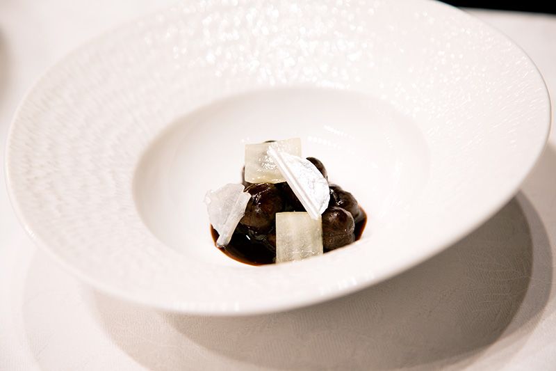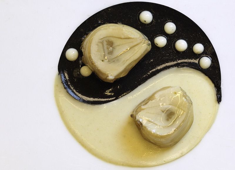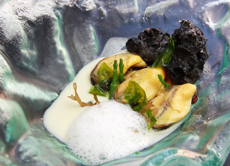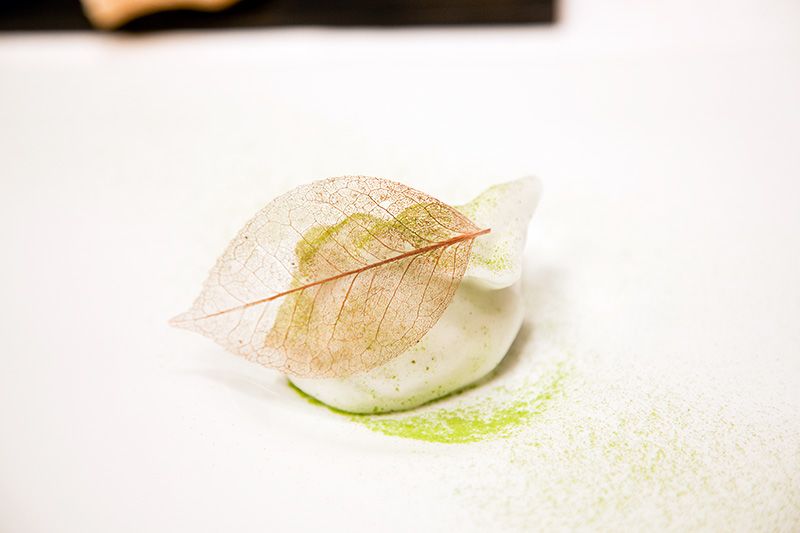 烏賊菜,盤子中央的岩石是用洋蔥、海藻和烏賊墨汁做成,用抹茶表現苔蘚