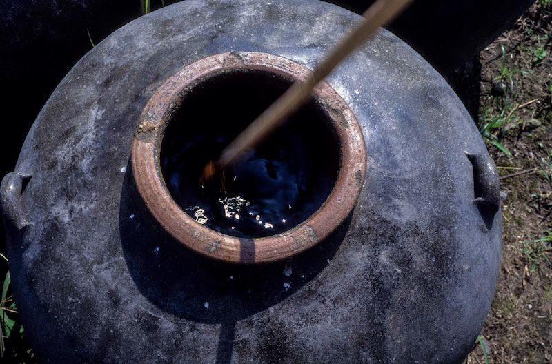 在陽光充足的地方,釀醋罈子排列得整整齊齊。黑罈能有效吸收太陽光熱。罈子容積恰到好處,如再加大就會溫度不足。罈子的顏色和大小都是亙古不變