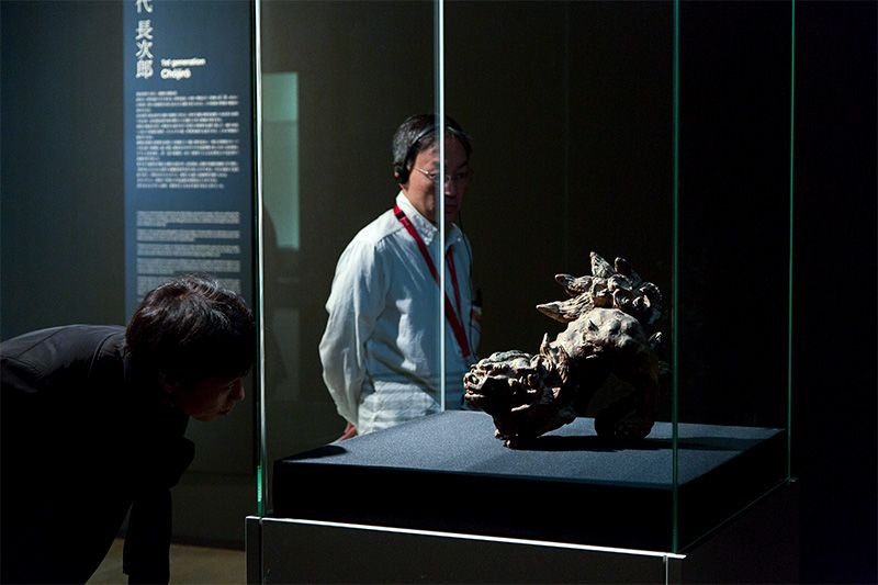 在展館入口處迎接觀眾的是第1代長次郎的「二彩獅子」,樂家第15代樂吉左衛門稱其為「破解長次郎茶碗之謎的鑰匙」,是長次郎在開始燒製茶碗之前完成的,也是長次郎唯一一件刻有作者名和燒製時間的作品。這件作品與靜寂的茶碗形成鮮明對照,給人以激烈的躍動感,同時也讓人強烈感受到與千利休的關聯。