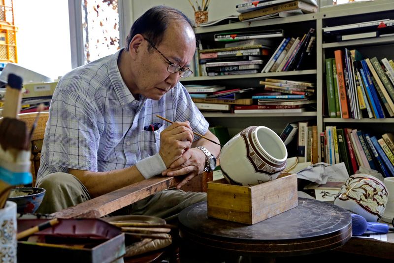 標題圖片:加藤幸兵衛在彩陶小碗上描繪圖案