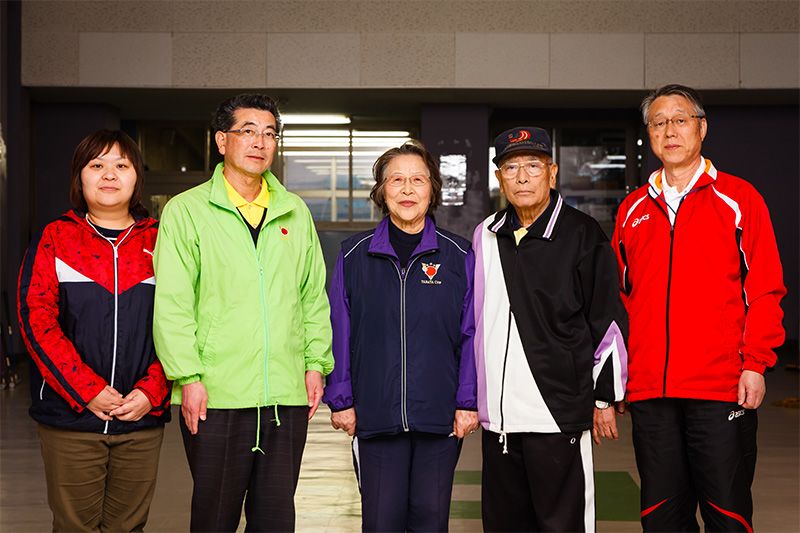 促成了槌球隊誕生的青森縣槌球協會會長久米田勇二(右2)和教練們。其中一位30多歲的女教練(左)從小就一直在打槌球