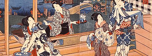 煙花柳巷的女子清晨梳妝打扮的情景。左邊的女子嘴裏銜著沐浴用的糠袋(POLA文化研究所收藏)