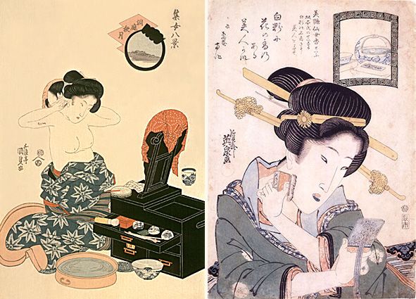 「日本人嚮往的白潤肌膚,較之顏色之白,更側重於『冰雕玉琢之感』,特別是在進入江戶時代後,為了美化皮膚,人們可謂煞費苦心」,POLA文化研究所研究員富澤洋子說道。據說江戶時代的女性為了強調自然柔嫩的肌膚,要花費相當長時間去化妝。多次反覆地上妝卸妝、面頰要用手巾擦拭、讓皮膚透亮的粉妝法等,這些在《都風俗化妝傳》中都作了介紹。