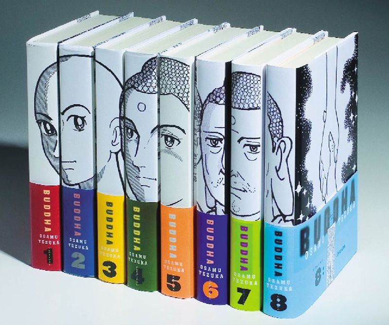 負責了手塚治虫作品英語版的裝幀設計工作。把《佛陀》全8卷排放在一起,你會在書脊上看到一個由青年過渡到老年的佛陀形象