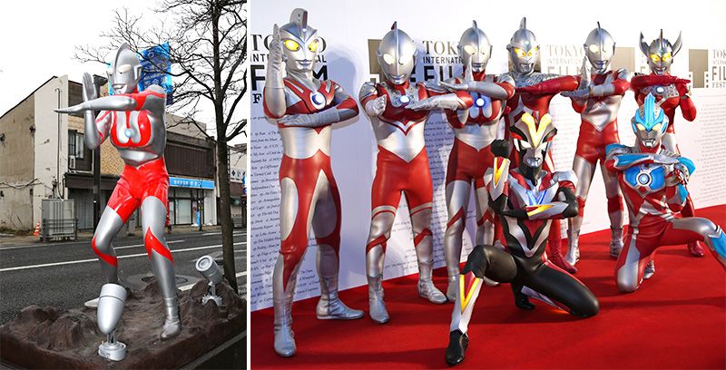 左:圓谷英二導演的故鄉福島縣須賀川市市區,發射SPECIUM光線的超人力霸王像(福島縣須賀川市。時事社)/右:超人力霸王英雄們齊聚2014年東京國際影展(時事社)