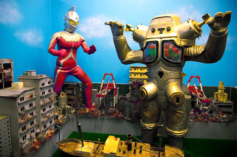 2012年的活動中展示的《超人七號》的立體透視模型,重現了《超級警備隊 向西挺進》(第14、15集)的場面。據說登場的怪獸金古喬就是從編劇金城哲夫的名字來的。(圖片:Rodrigo Reyes Marin/ Aflo)