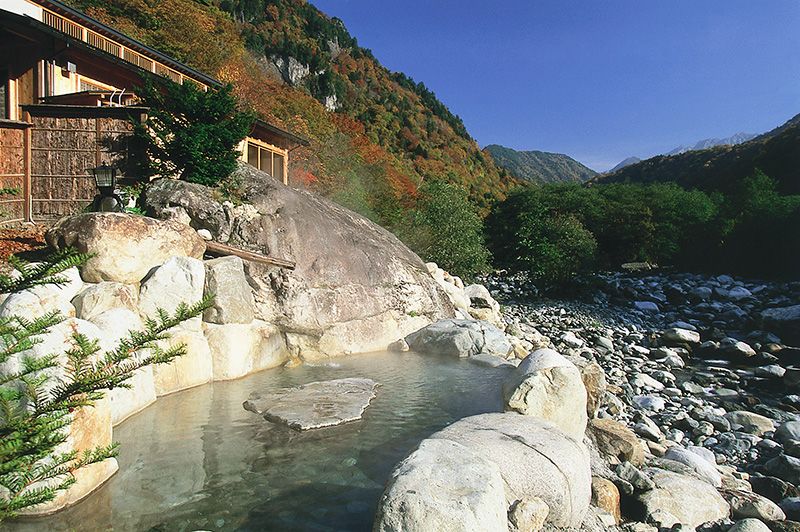 號稱日本北阿爾卑斯山脈的飛驒山脈,海拔3,000m的高峰連綿不絕。奧飛驒溫泉鄉便是散布在山腳下的溫泉群的總稱。坐擁雄偉壯觀的大自然,這裏沒有沾染世俗商業的氣息。溫泉是清澈柔和的單一成分溫泉,遊客可以泡在充滿野性魅力的露天溫泉裏欣賞雄偉的自然風光。