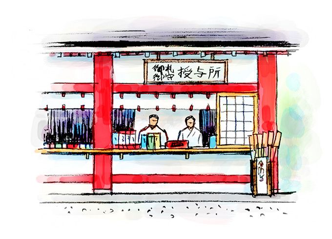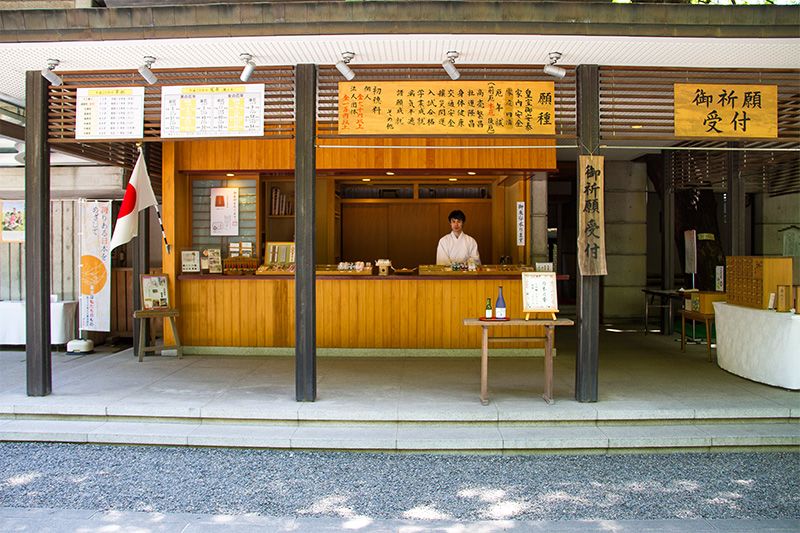 神社內還設有附屬設施「社務所」,它是神職人員和巫女工作休息之處,他們在這裏處理有關神社的各種事務,向祭拜者介紹神社和所祀神靈並受理求神者祈禱委託,在拜殿等建築前還對外授予(出售)神符、護身符、破魔箭、繪馬和神籤等。