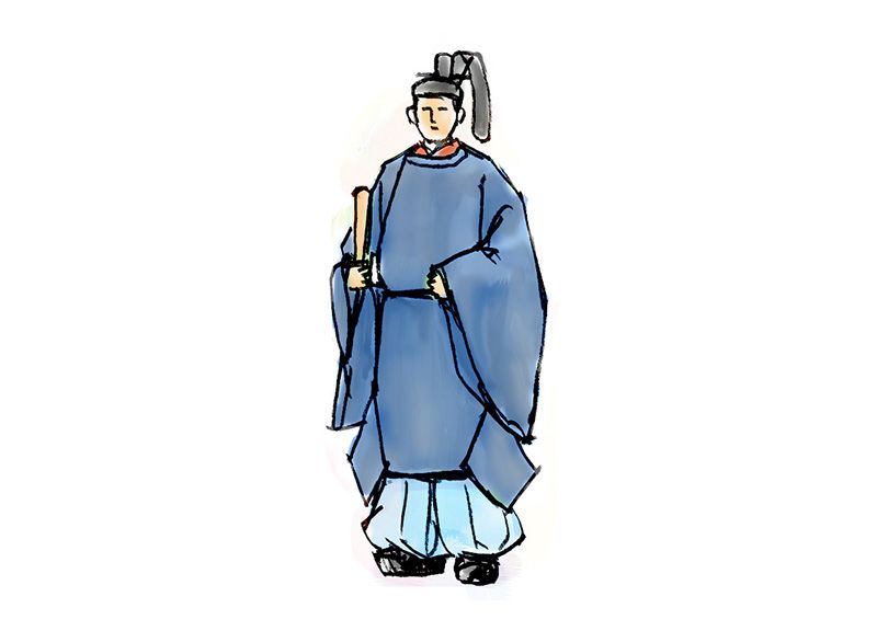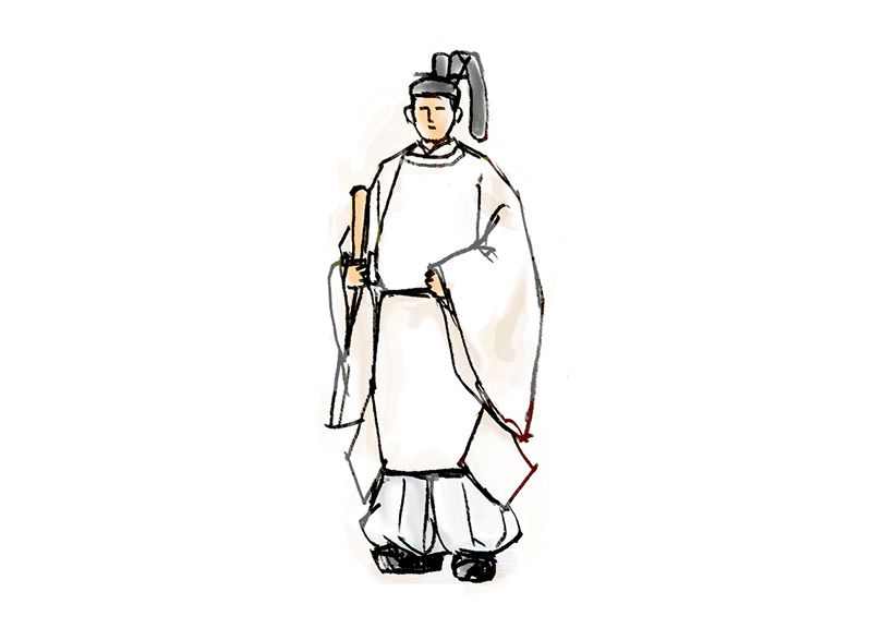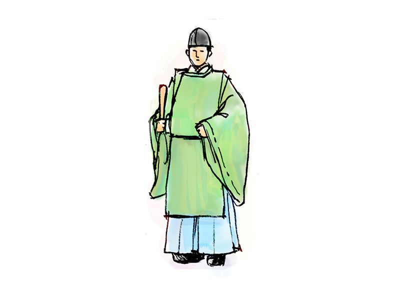 神職人員的正裝(三級、四級)。疏紋頭冠、無紋綠袍、淺黃無花平紋綢袴