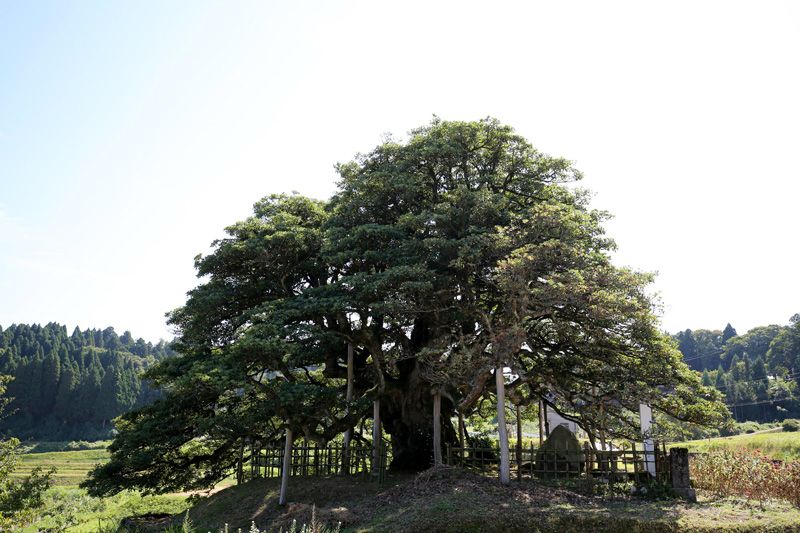 從位於能登半島與主島臨近地帶的漁港城市冰見市驅車向北行駛約10km,當你眺望著緩坡上的梯田繼續向前時,道旁一棵悠然獨立的巨大紅楠便會映入眼簾,它就是「長坂的大紅楠」。