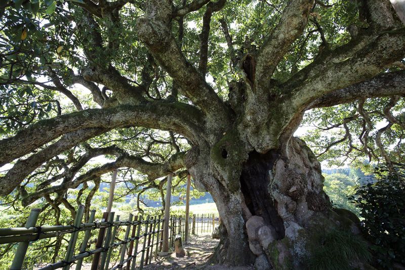 巨樹主幹上有一個很大的空洞,但樹木依然長勢旺盛,向外伸展的部分枝幹垂到低於根部的位置,可見這棵紅楠生長得多麼茁壯。樹冠(從樹幹生長出的枝葉的總稱)遮光蔽日,白天也很陰暗,置身它的下面,讓你倍感涼爽舒適。