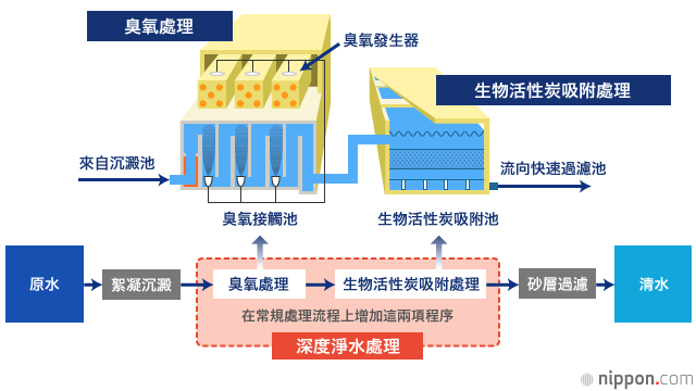「所謂深度淨水處理,是指在常規處理的基礎上,增加臭氧處理和生物活性炭吸附處理這兩道程序,由此除去在常規處理中難以去除的幾乎所有微量有機物質。」(橋本)