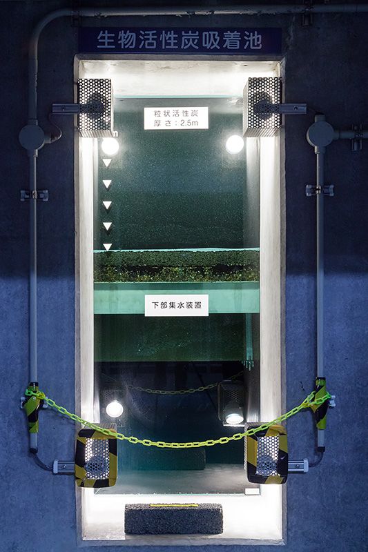 常規程序加臭氧處理之後,猶如在深度淨化中多加一道保險一般,還要再進行一道淨化處理程序。這個作業區有12個生物活性炭吸附池,也能透過玻璃觀察到其底部的部分側面。每個池子裏鋪著厚達2.5m的活性炭層。這些活性炭不僅能夠吸附被臭氧分解的雜質,而且在繁殖於活性炭上的微生物作用下,還能分解殘存的更加微小的雜質。活性炭的材質和家用淨水器的相似,但由於自來水廠的處理量大,所以需要很大的過濾面積。在三園自來水廠,每個池子面積大約為100m3。