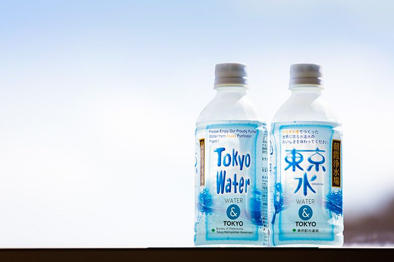 瓶裝的東京都自來水。瓶子正面寫著:「請品嘗世界最可口的自來水」
