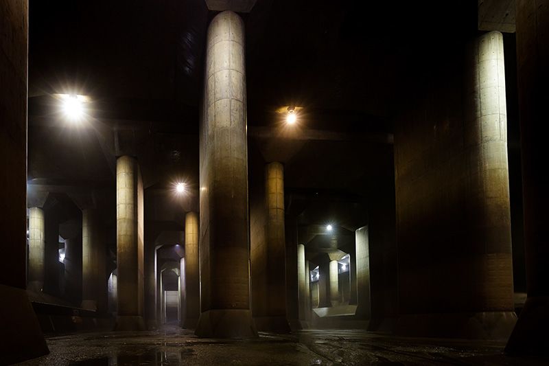 在江戶川岸邊足球場的一角,有一座不起眼的小屋。從那裏走下116級臺階,出現在眼前的,是一個長177m、寬78m、高18m的巨大地下空間。那裏整齊地林立著59根水泥柱,每根柱子重達500t。這裏是首都圈外廓放水路的調壓水槽,氣氛莊嚴,有「地下神殿」之稱,在全球都擁有狂熱愛好者。地點位於埼玉縣春日部市,熱門特攝電視劇《假面騎士》系列頻繁使用此地作為外景地,因此作為「特攝聖地」而聞名,也經常被用作時尚雜誌、人氣歌手MV、電影等的拍攝場地。