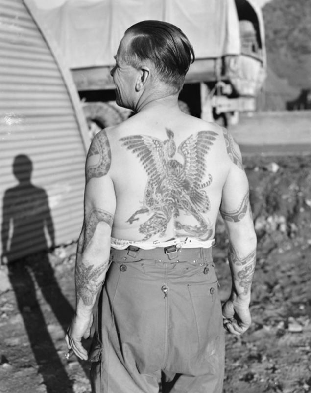1953年12月,在韓國拍攝的澳洲士兵。據說這些文身是在埃及、英國、香港、日本和印度文刺的。收藏於澳洲戰爭紀念館(https://www.awm.gov.au/collection/HOBJ4707/)