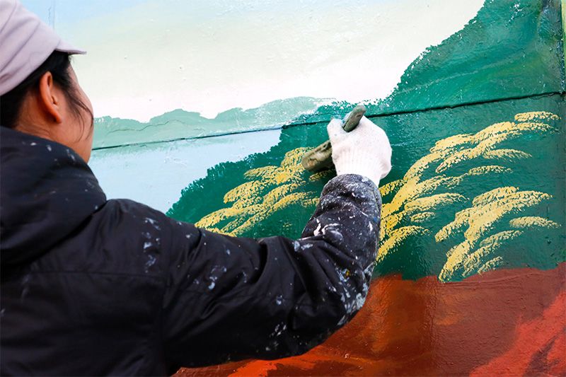 1月份的一天,在位於東京都江戶川區葛西的錢湯「仲之湯」,田中從早上8點左右就搭建起腳手架,開始了女浴池的壁面油漆畫繪製工作。她計畫利用錢湯的休息日的一整天時間,先後完成女浴池和男浴池的壁畫繪製。壁畫寬約6m,(從浴池起算)高約3m。她爬上梯子,先從接近天花板的天空圖案部分開始著手漆繪。