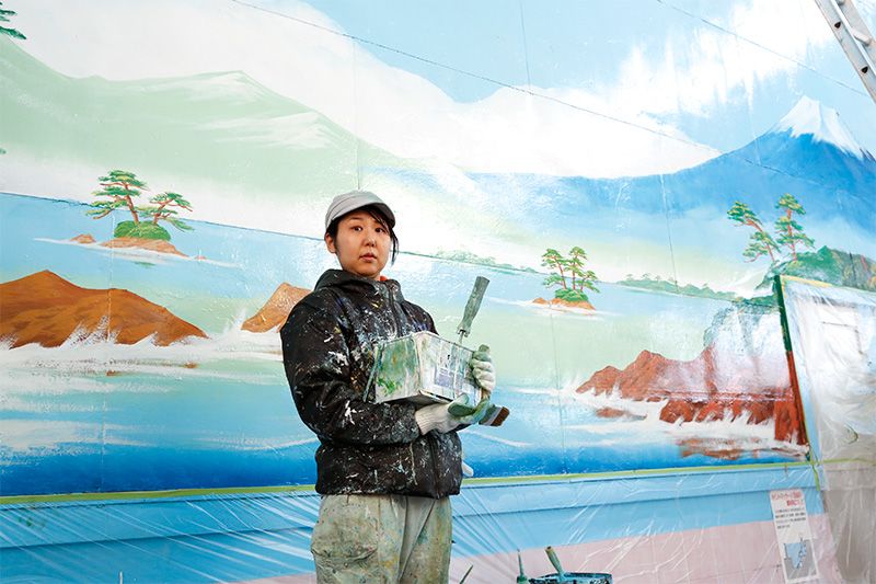 田中的工作從去除現有繪畫上油漆脫落的部分開始。然後,一邊考慮構圖的整體平衡,一邊用刷子層層疊疊地描繪出天空、雲彩、近景、遠景和富士山。這份工作需要膽大心細,同時也要具備充足的體力和專注力。女浴池的壁畫繪製完成後,立刻轉戰男浴池。完成全部工作的時候,已接近晚上9點了。與上一幅繪畫相比,田中新繪製的圖案色調柔和,展現出一派優雅的富士山風光。