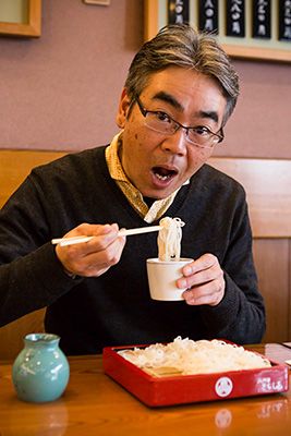 「要享受蕎麥麵的香味,自然會吸著吃吧。蕎麥的香味本來不是通過鼻子,而是在口中感受的。品嘗葡萄酒時,首先用鼻子聞其香氣,然後把酒含在嘴裡翻轉,感受從喉嚨擴散到鼻腔中的酒香。好像前者被稱之為『鼻前嗅覺(彌散的酒香)』,後者為『鼻後嗅覺(餘香)』。蕎麥麵散發的香氣較弱,所以要享受它的餘香。尤其是籠屜蕎麥麵,因為是冷麵,氣味不易散發出來,用鼻子也聞不到。只有用力吸食,感受彌散在口中的香味,才是正確的吃法。」