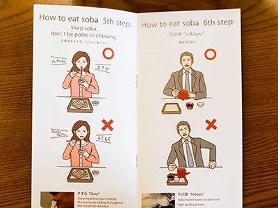 吃蕎麥麵的最好方法就是「吸食」。既然如此,就不要談什麼「麵條騷擾」了,還是把這種吃法推廣到全世界才好。那麼「總本家更科堀井」是如何向外國遊客傳授蕎麥麵吃法的呢?