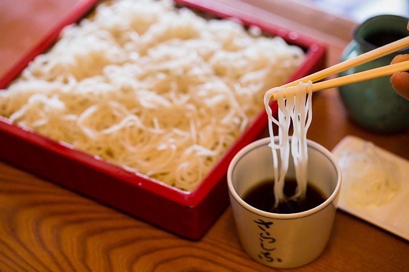 「要享受蕎麥麵的香味,自然會吸著吃吧。蕎麥的香味本來不是通過鼻子,而是在口中感受的。品嘗葡萄酒時,首先用鼻子聞其香氣,然後把酒含在嘴裡翻轉,感受從喉嚨擴散到鼻腔中的酒香。好像前者被稱之為『鼻前嗅覺(彌散的酒香)』,後者為『鼻後嗅覺(餘香)』。蕎麥麵散發的香氣較弱,所以要享受它的餘香。尤其是籠屜蕎麥麵,因為是冷麵,氣味不易散發出來,用鼻子也聞不到。只有用力吸食,感受彌散在口中的香味,才是正確的吃法。」